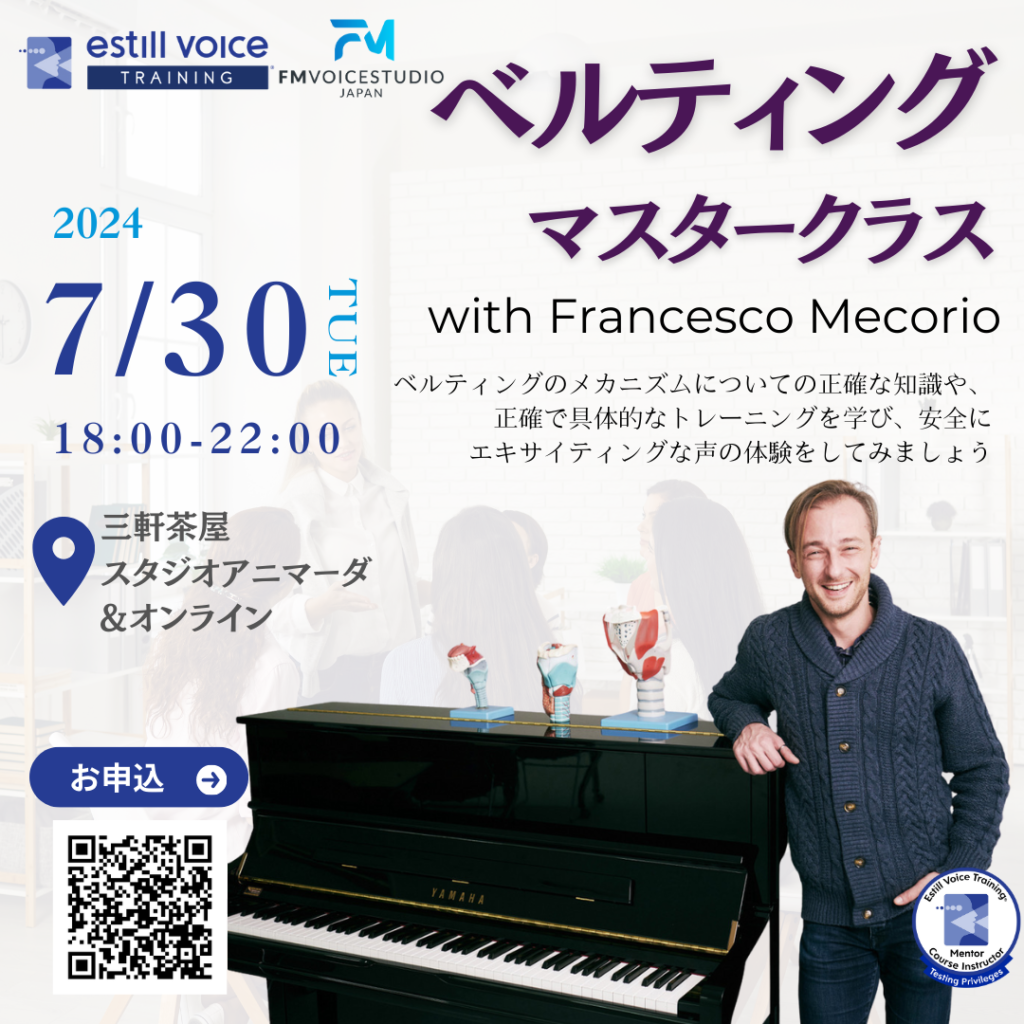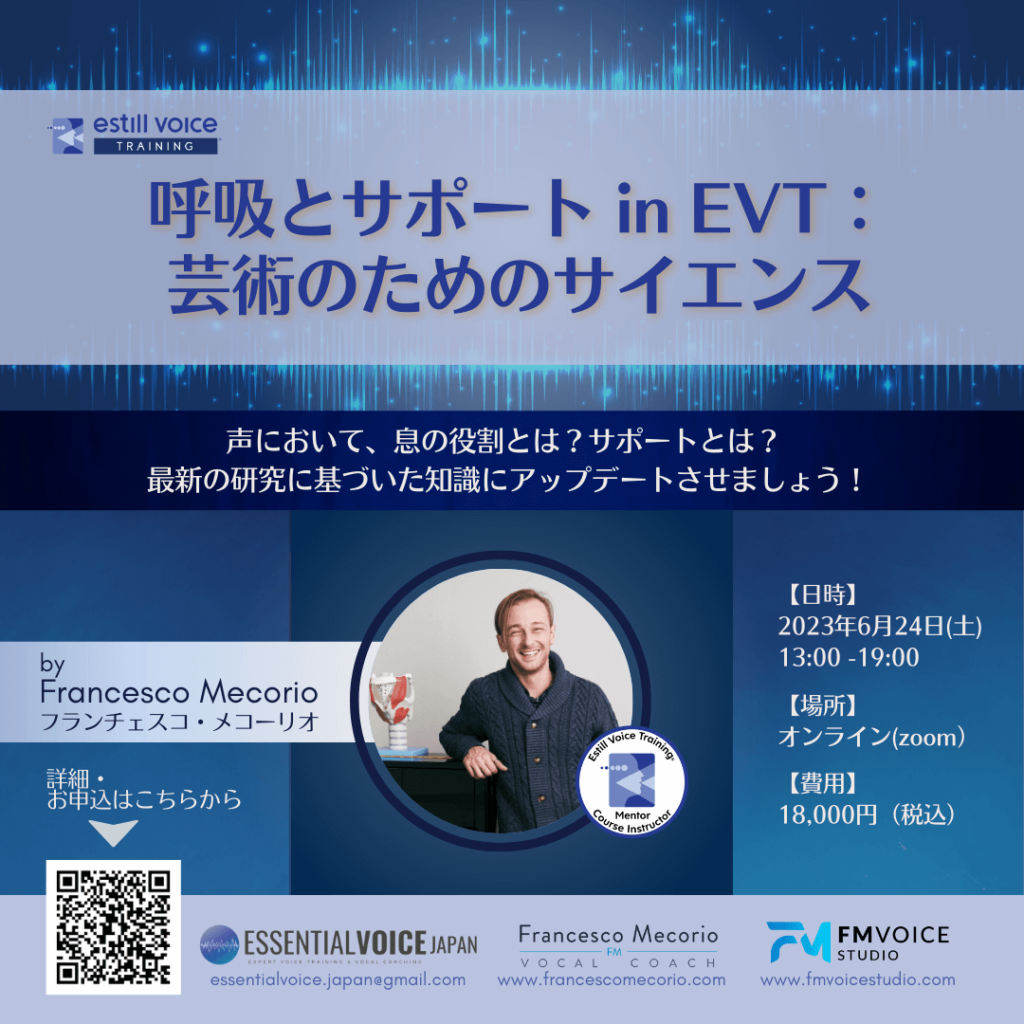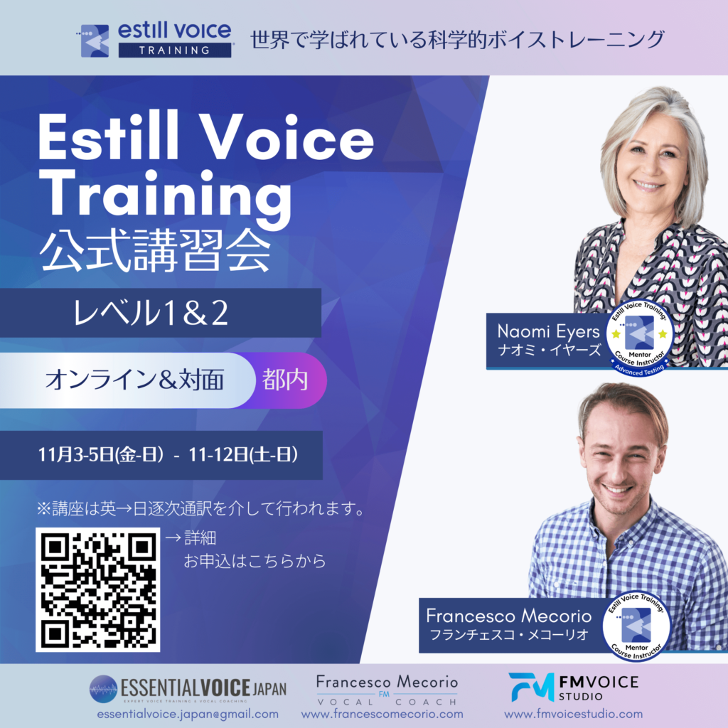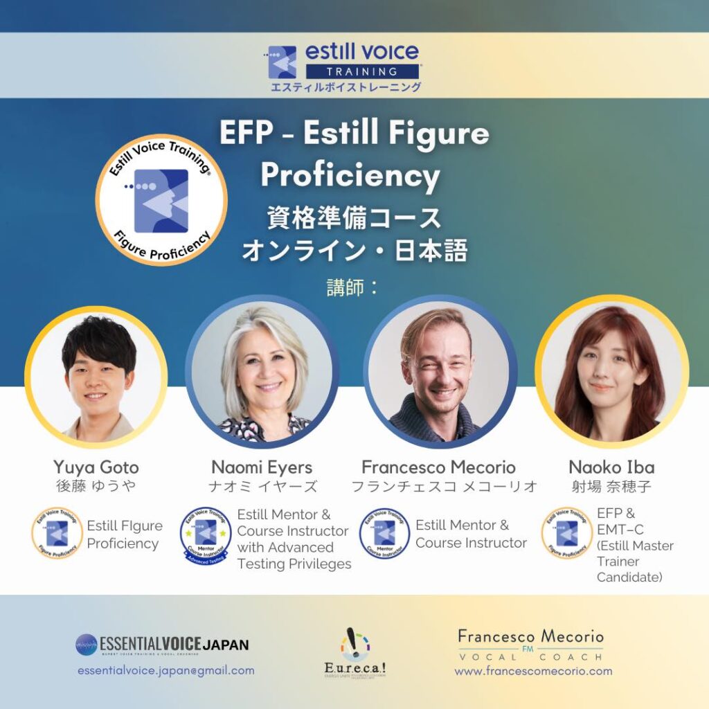 EFPとはEstill Figure Proficiencyの略で、Estill Voice Training® における最初の資格となります。この資格は、フィギュア(発声要素)を正確に再現できる個人の能力を証明するものです。また、次のステップであるEstill Master Trainerになるためには必須の資格となります。