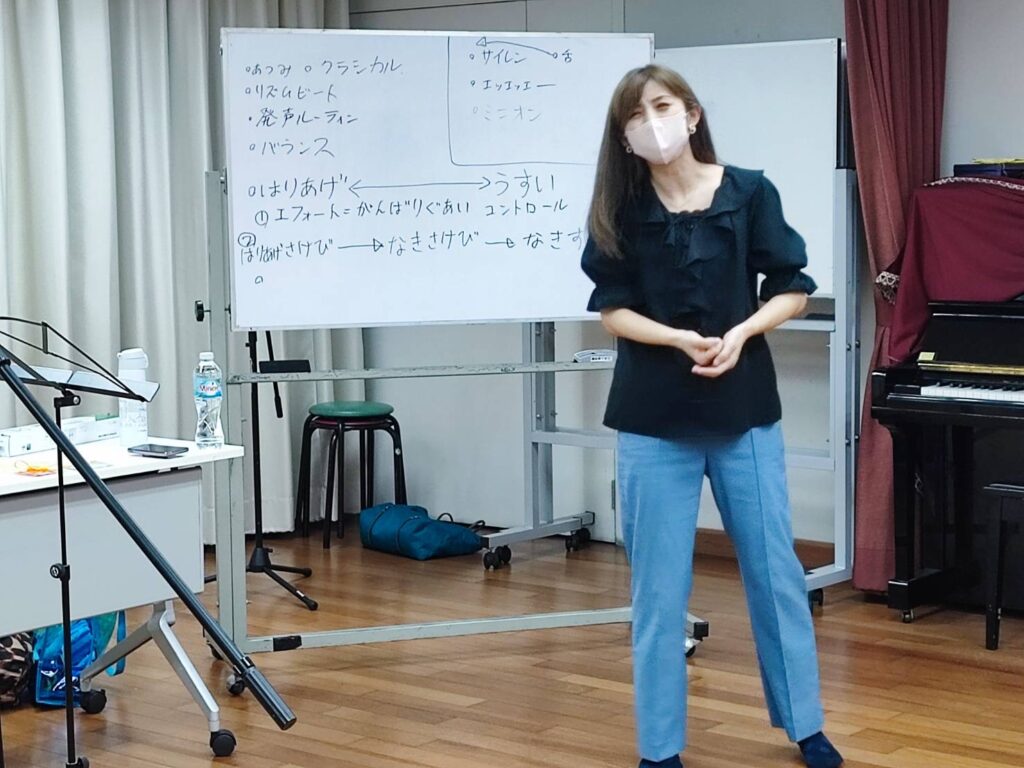 まずは、なぜ出来ないのか?という原因を分析し、例えば「喉頭の位置が低い」事が原因であった場合は、どういう動きが必要なのかを具体的に体と耳を使って理解していきます。